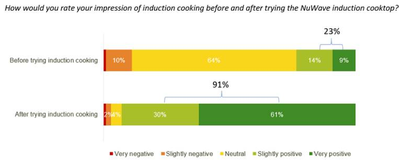 The initial results show a positive likelihood of adoption from Plugged In members who tested the induction cooktop, with 23% stating a positive impression of induction cooking before the trials and 91% stating a positive impression of induction after the trial.